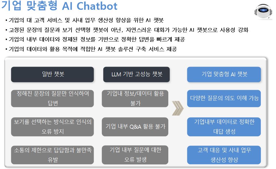 고정된 문장과 선택형 쳇봇이 아닌 기업내 정제된 자료 기반의 자연스러운 대화 가능한 쳇봇